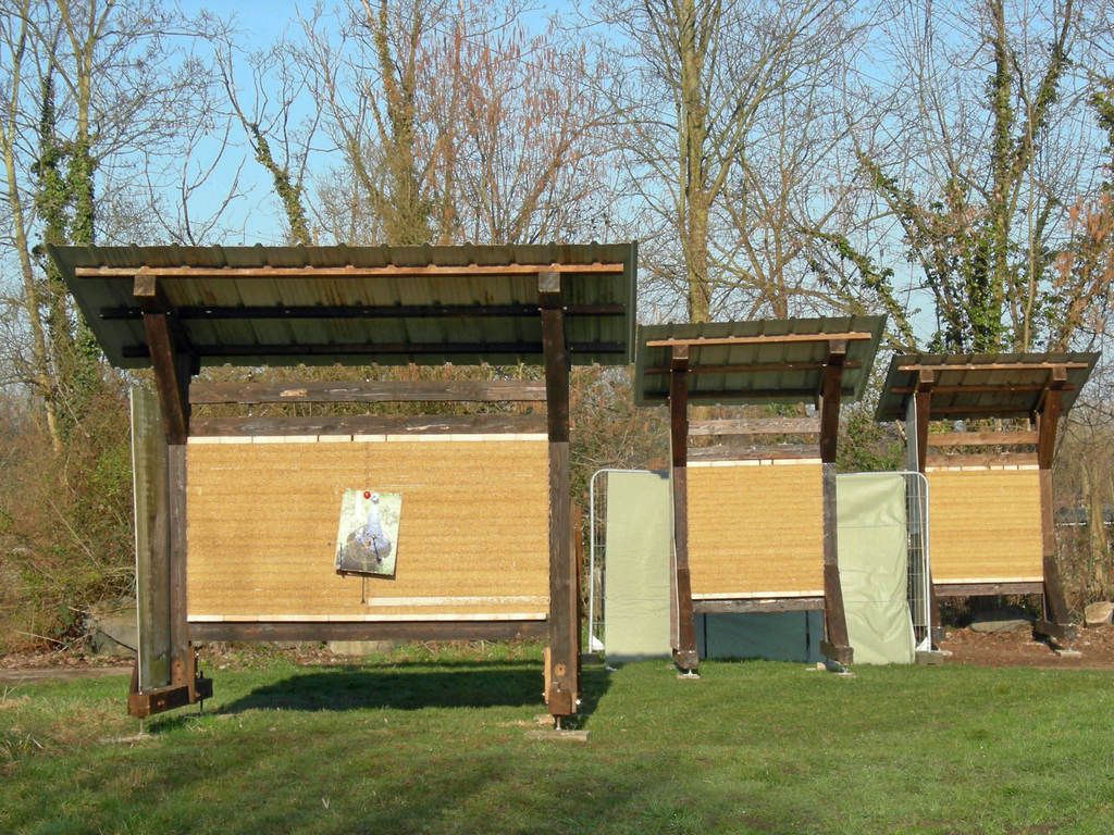 Les cibles d'échauffement ont pu être finalisées, nous disposons maintenant d'une double à 18m, une simple à 25m et une à 30m. Le bois provenant de l'élagage a été débité et rangé en prévision des prochains barbecues et tartes flambées, les chemins recouverts de copeaux et palettes pour les parties les plus humides et la charpente de notre abri se précise. La prochaine VA devrait nous permettre d'entamer la couverture entre les 2 containers.