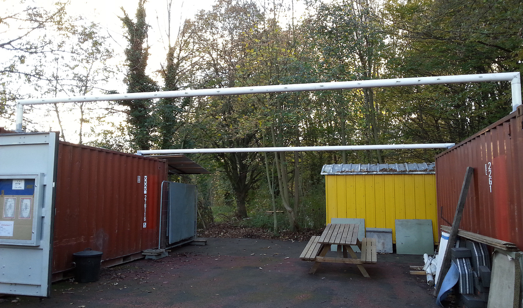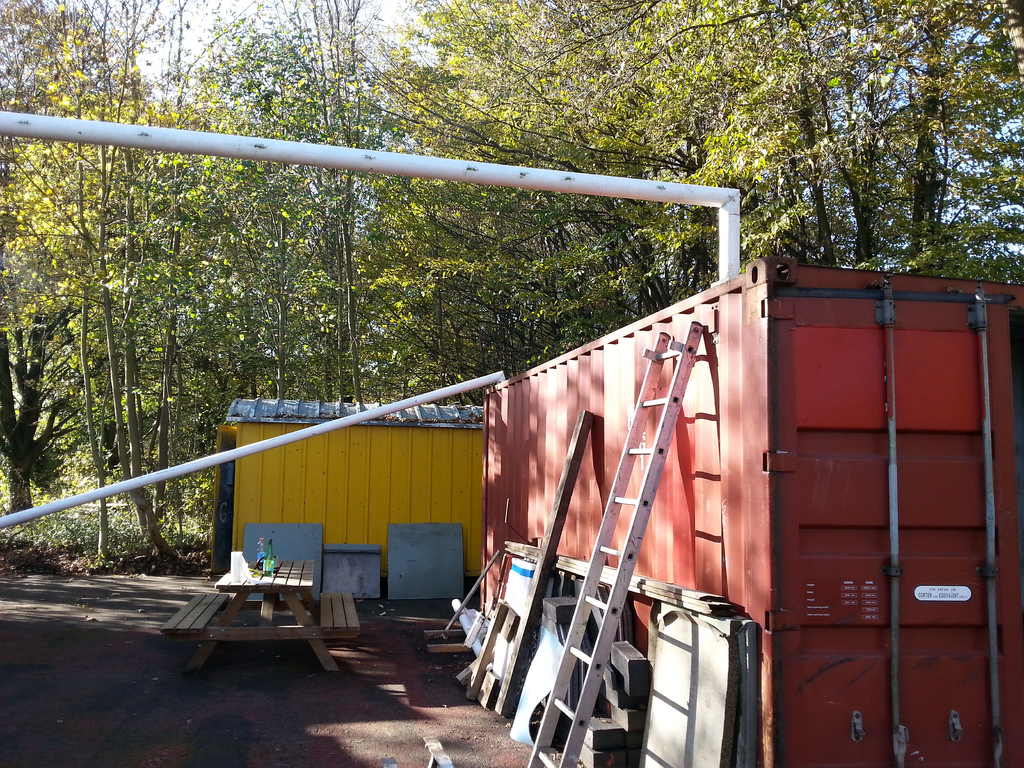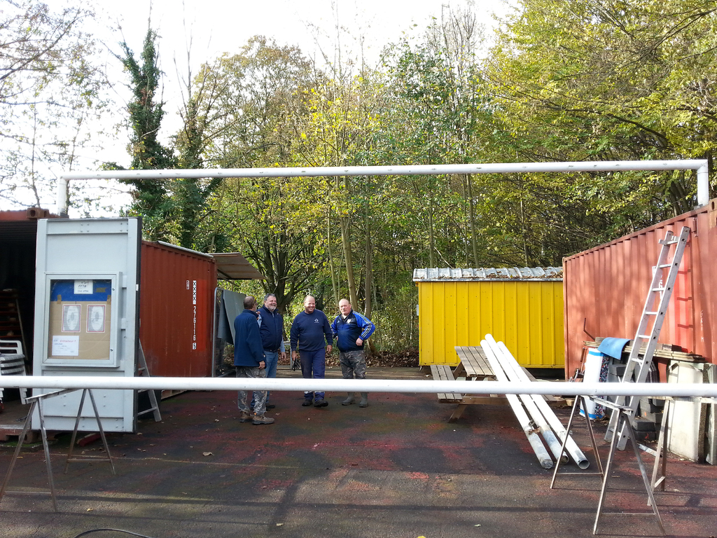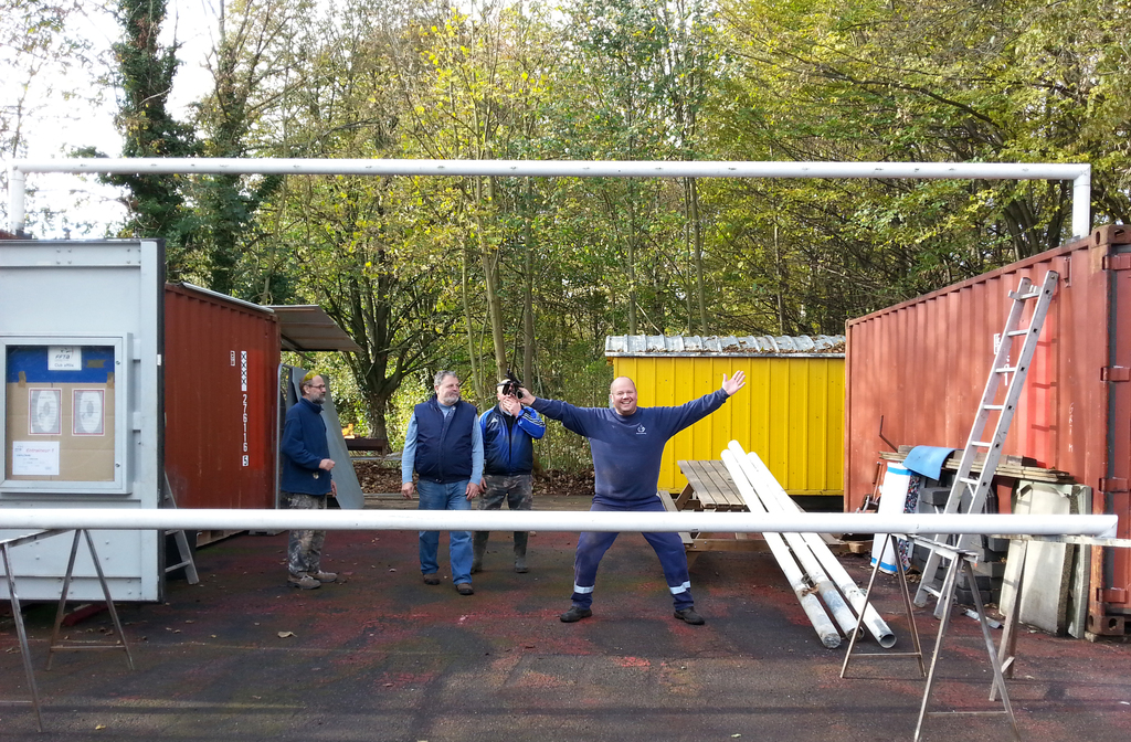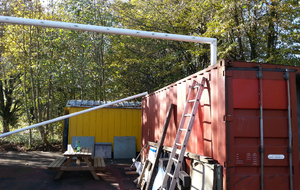 - la construction d'un préau entre les 2 conteneurs en recyclant des transversales de buts de foot. Une fois couvert de tôles de bardage (merci Pascal), cette installation nous permettra de disposer de 35 m2 couverts avec la possibilité de bâcher 1 voir 2 cotés.