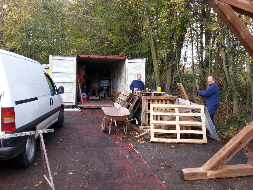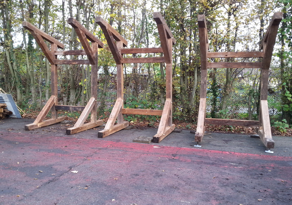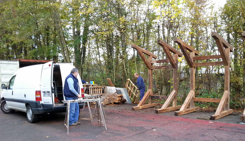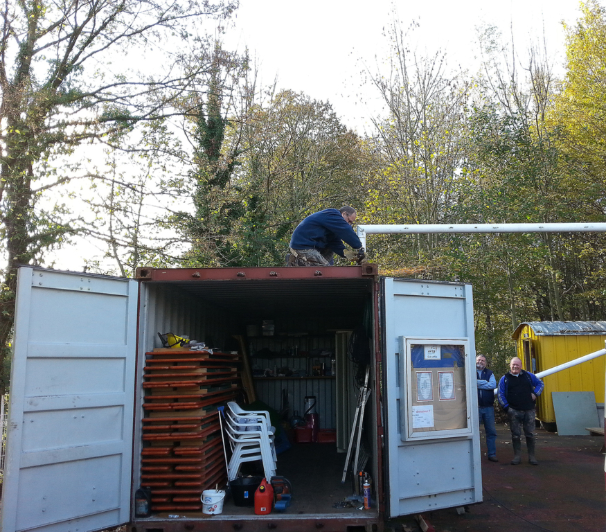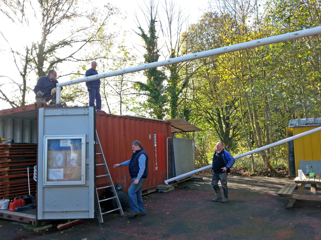 - la construction d'un préau entre les 2 conteneurs en recyclant des transversales de buts de foot. Une fois couvert de tôles de bardage (merci Pascal), cette installation nous permettra de disposer de 35 m2 couverts avec la possibilité de bâcher 1 voir 2 cotés.
