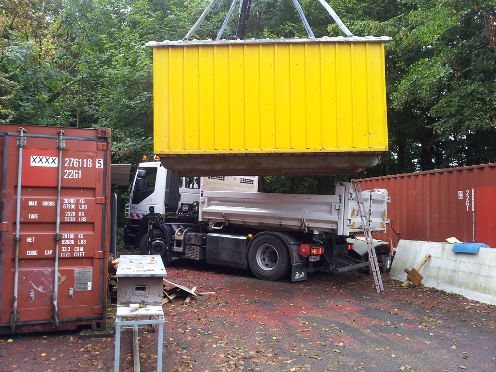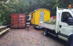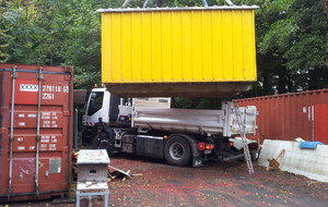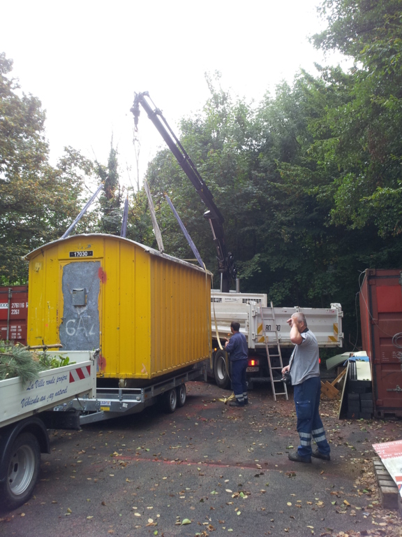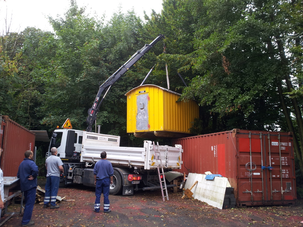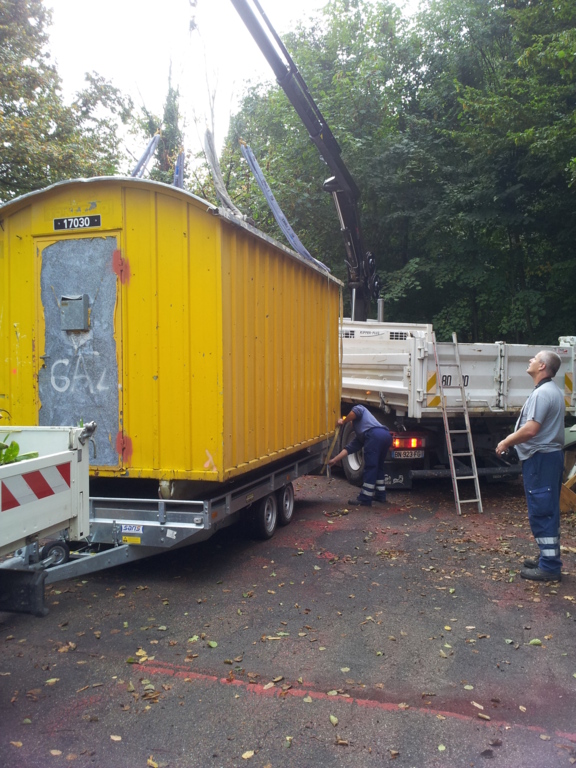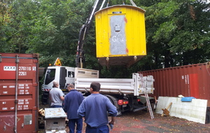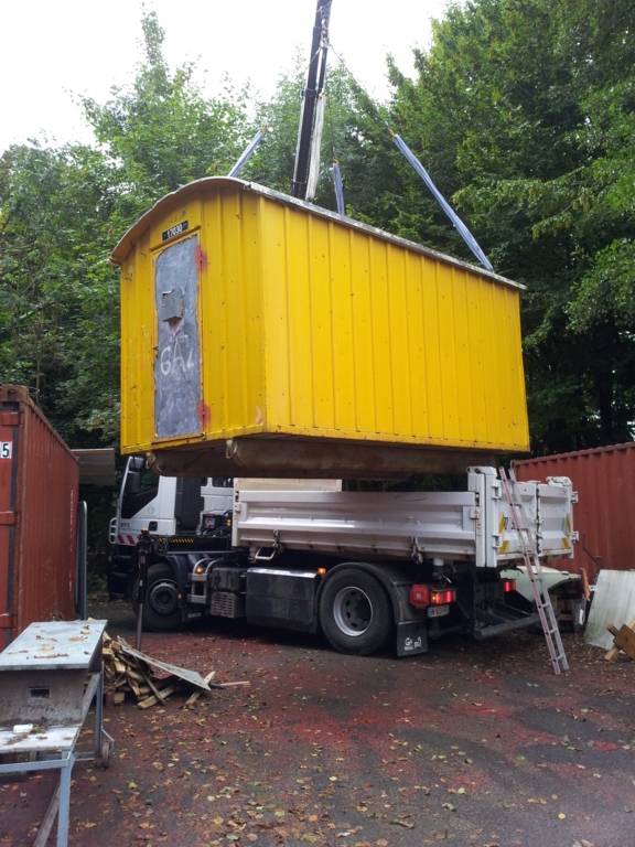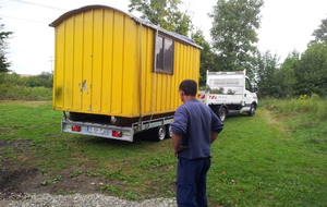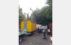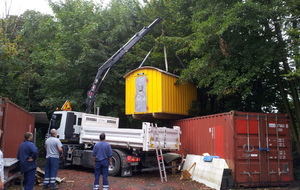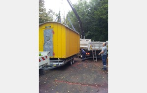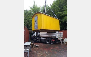 La baraque de 1 500 kg a été chargée à l' aide d'un camion grue, sur une remorque pour une petite balade de 6 km et être amenée sur notre terrain où elle terminera sa vie en tant qu'abri et baraque à palabres pour le conseil des sages du club... : )
