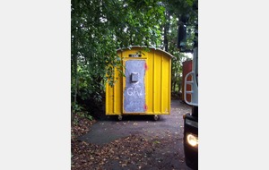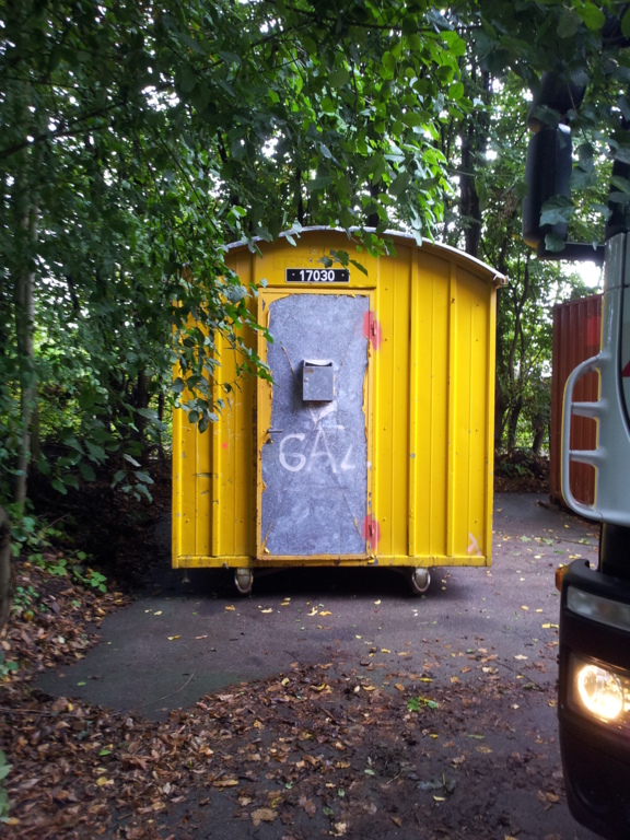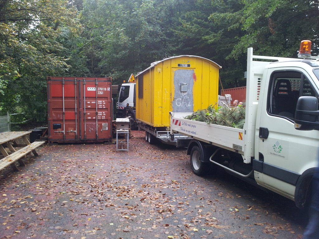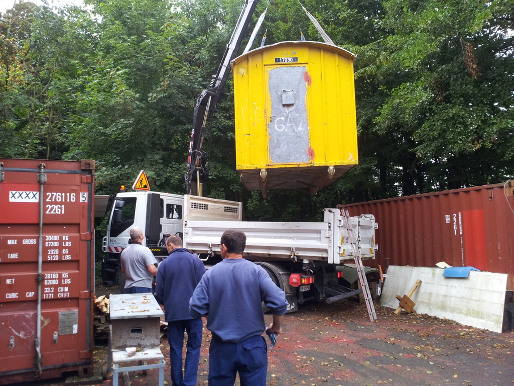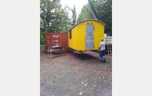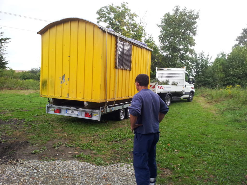 La baraque de 1 500 kg a été chargée à l' aide d'un camion grue, sur une remorque pour une petite balade de 6 km et être amenée sur notre terrain où elle terminera sa vie en tant qu'abri et baraque à palabres pour le conseil des sages du club... : )