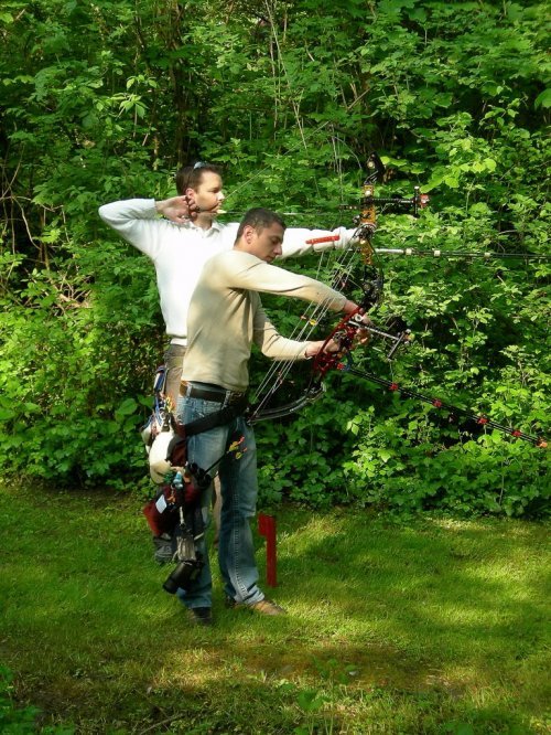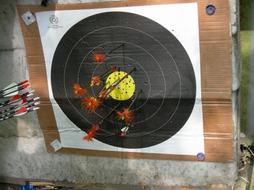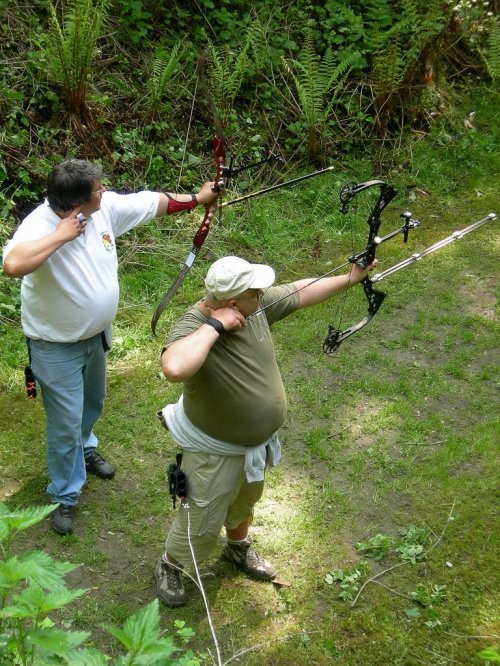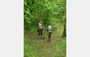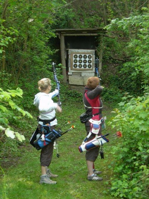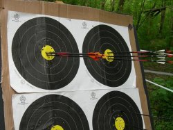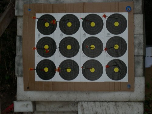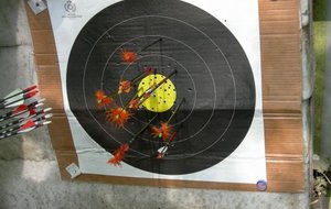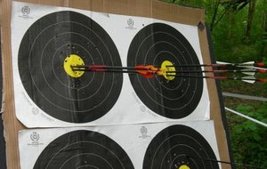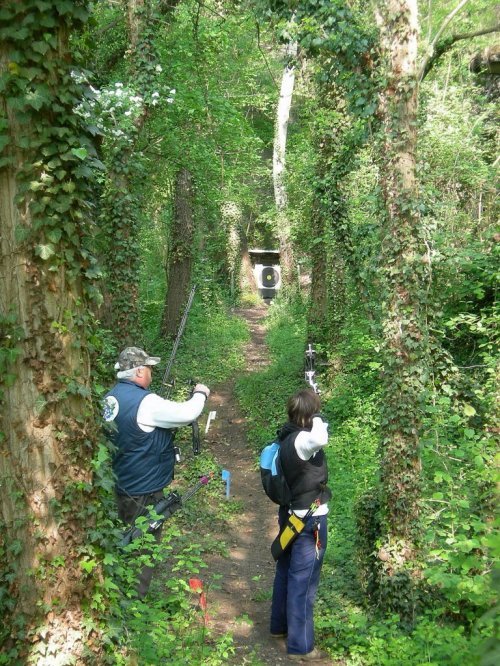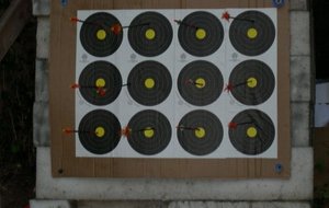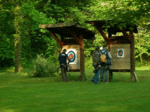 Sous la houlette de notre coach (Bertrand) les blasons campagne ont donc remplacé les blasons nature sur des cibles existantes et quelques nouvelles, créées pour l'occasion. Pour ceux qui ne connaissent pas : c'est un parcours de 12 cibles que l'on fait une première fois en distances inconnues et une seconde fois avec d'autres pas de tir qui donnent la distance (de 5 à 60 m quand même...) 3 flêches sont tirées d'un même pas (en 3 mn maxi) avec 6 points possibles par flêches.