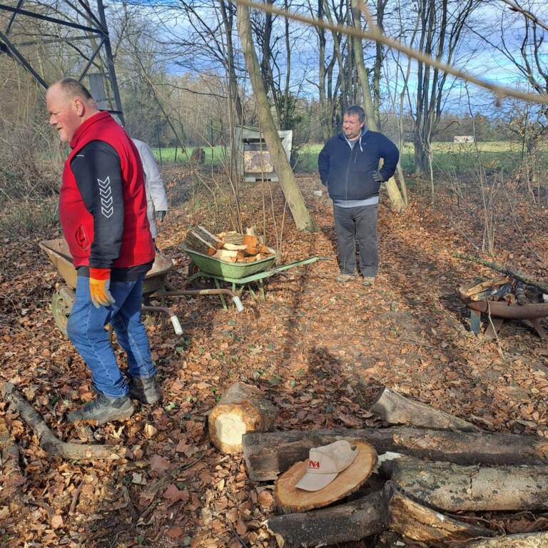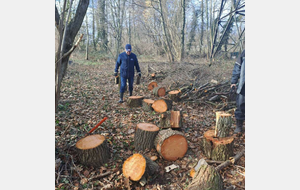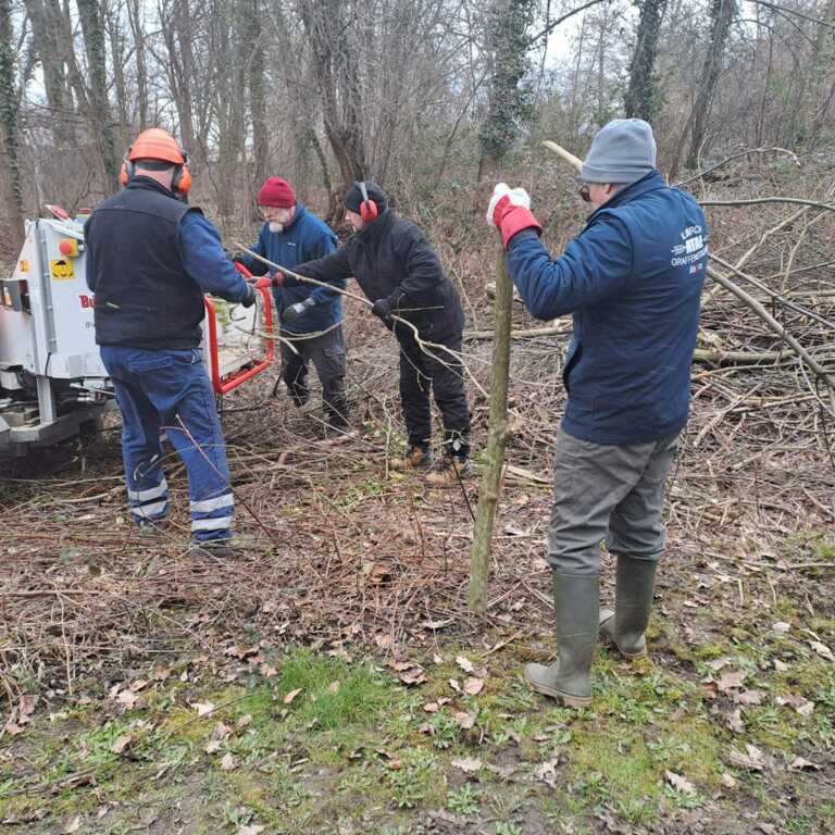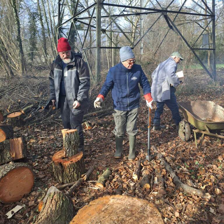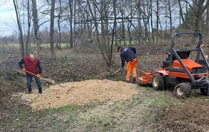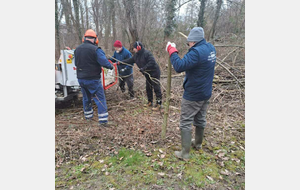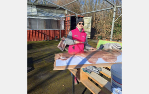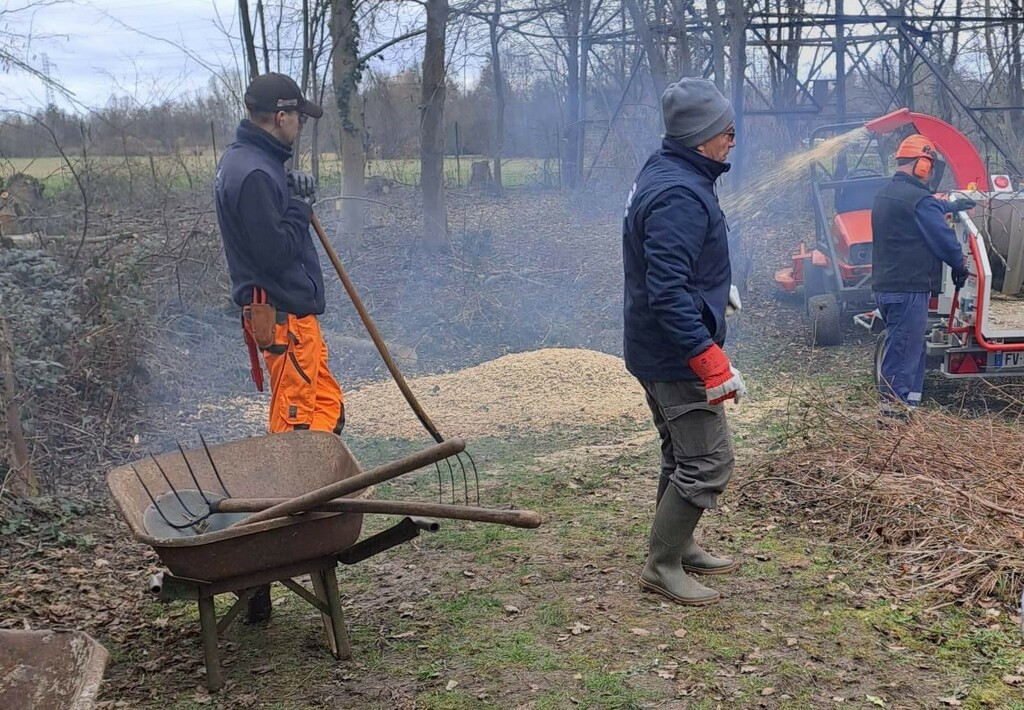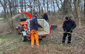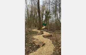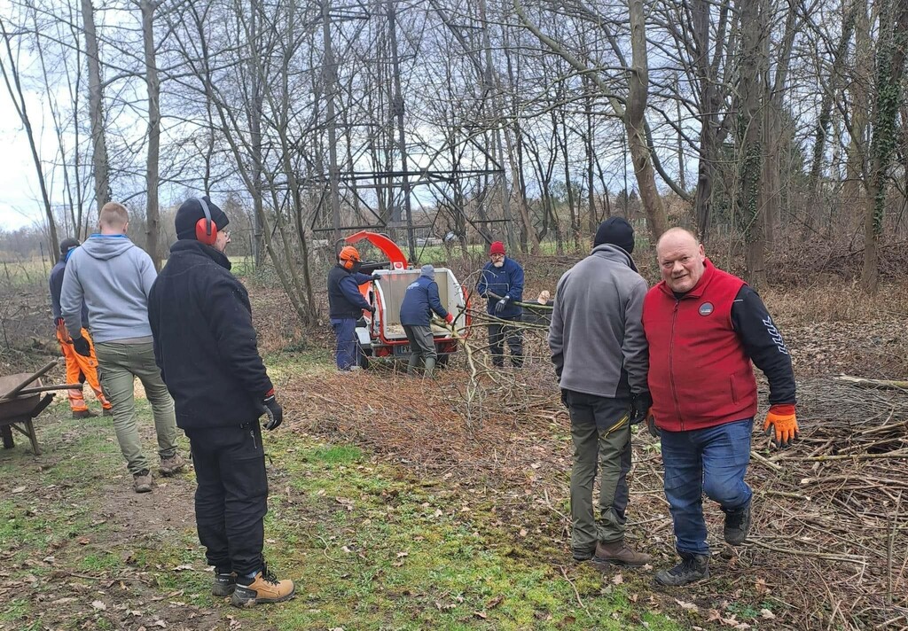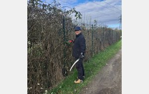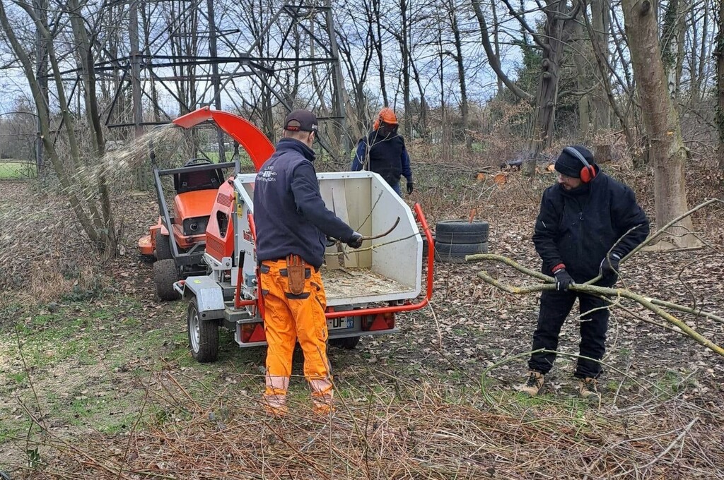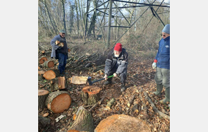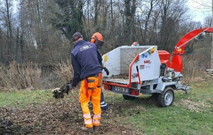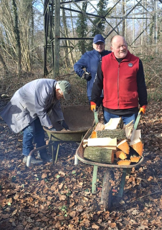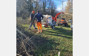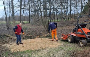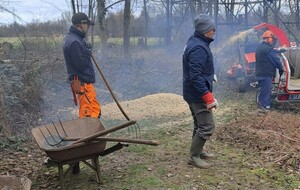 Les tas de branches, résidus de nos précedentes VA et l'abattage d'arbres sous la ligne haute tension par les bucherons mandatés par RTE ont motivé l'organisation d'une opération de broyage et découpe de bois. Travaux qui nous ont permis de mettre des copeaux sur les cheminements boueux du parcours et stocker du bois pour nos futurs barbecues et tartes flambées. La haie d'enceinte a été retaillée, des blasons collés, les taupinières égalisées. Une journée bien remplie !