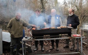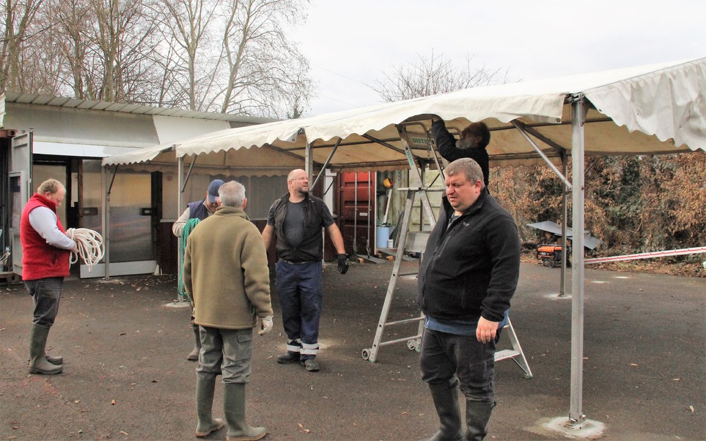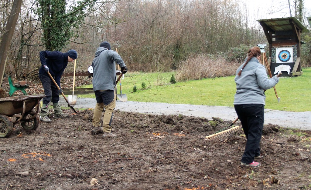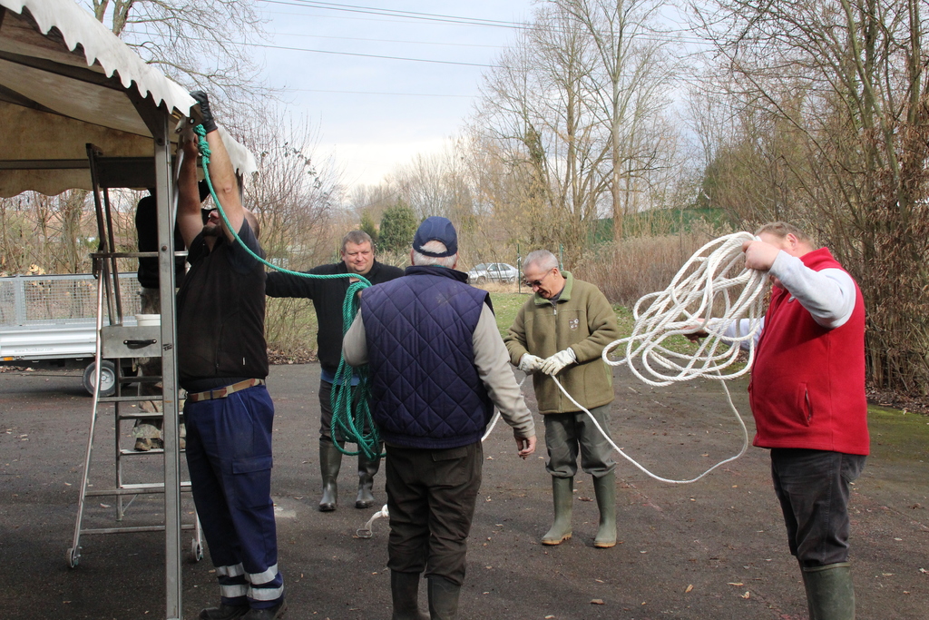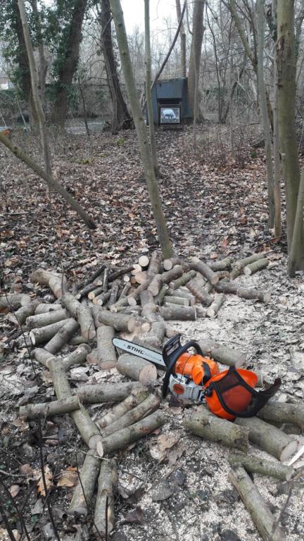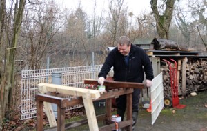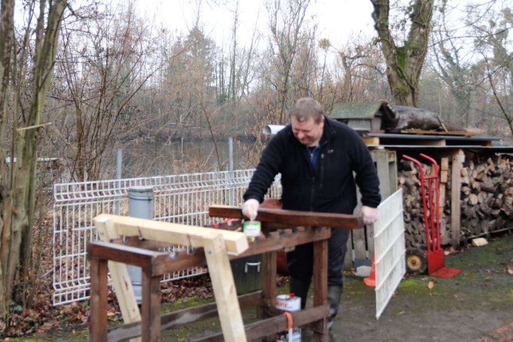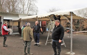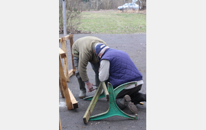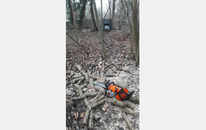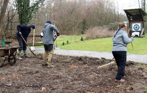 Au programme, taille des haies, abattage d'arbres morts, préparation de bois, réparation de la clôture, démontage du banc, préparation de l'emplacement du futur abri de l'aire d'échauffement, modif du poteau de soutien du filet de protection, montage des baches de toit et lazure des nouveaux chassis de cibles.